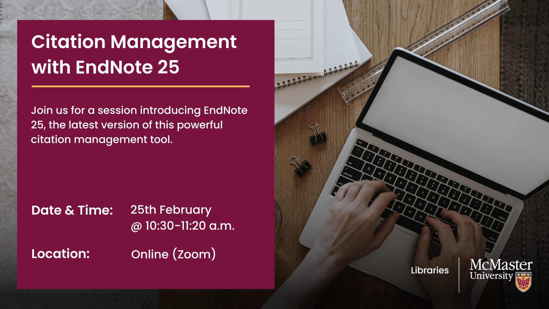 Join us for a session introducing EndNote 25, the latest version of this powerful citation management tool. Delivered by a McMaster librarian, this workshop will guide participants through creating and organizing a personal reference library, importing citations from databases, annotating PDFs, and generating bibliographies in popular styles like AMA, APA and MLA. The session will also highlight new features in EndNote 25, including AI-assisted tools for managing references and streamlining the research process.